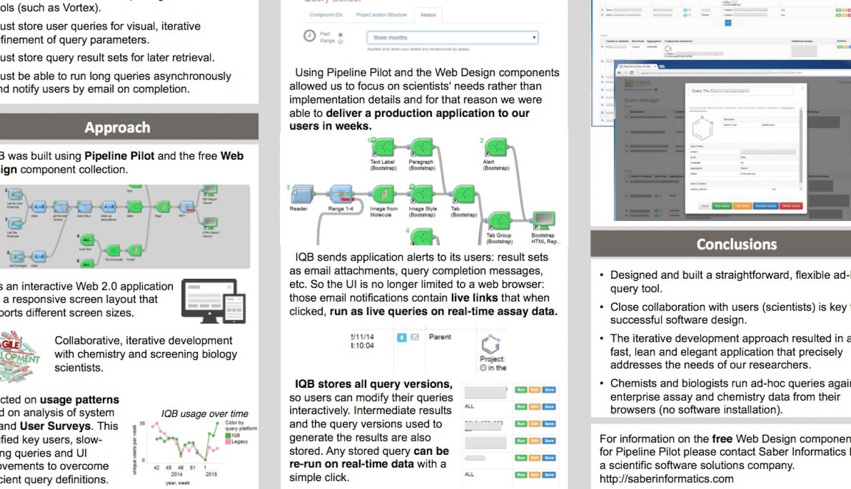 IQB was designed and implemented collaboratively with chemists and screening biologists. Functionality features were prioritized using real-time feedback on usage patterns. The iterative development approach resulted in a fast, lean and elegant application that precisely addresses the needs of our researchers.